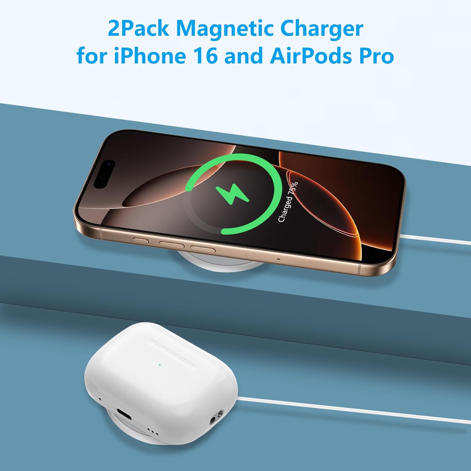 Magnetic Wireless Charger for iPhone 16 Pro Max/16 Pro/15/14/13/12/Plus/AirPods 3/2/Pro 2, 6FT Magnet Charge for Apple Mag-Safe Charger Fast Wireless Charging Pad with USB C Charging Block, 2Pack